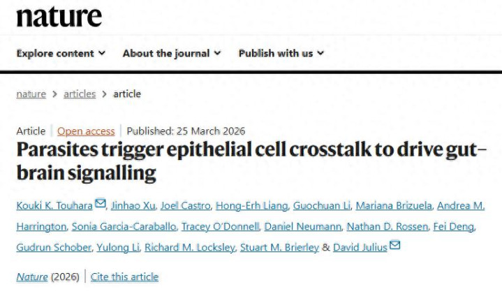 Touhara KK, Xu J, Castro J, Liang HE, Li G, Brizuela M, Harrington AM, Garcia-Caraballo S, O'Donnell T, Neumann D豪门国际, Rossen ND, Deng F, Schober G, Li Y, Locksley RM, Brierley SM, Julius D. Parasites trigger epithelial cell crosstalk to drive gut-brain signalling. Nature. 2026 Mar 25. doi: 10.1038/s41586-026-10281-5. Epub ahead of print. PMID: 41882357.
