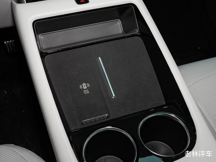 该车继承的电子怀挡,前排配有50W手机无线充电面板。