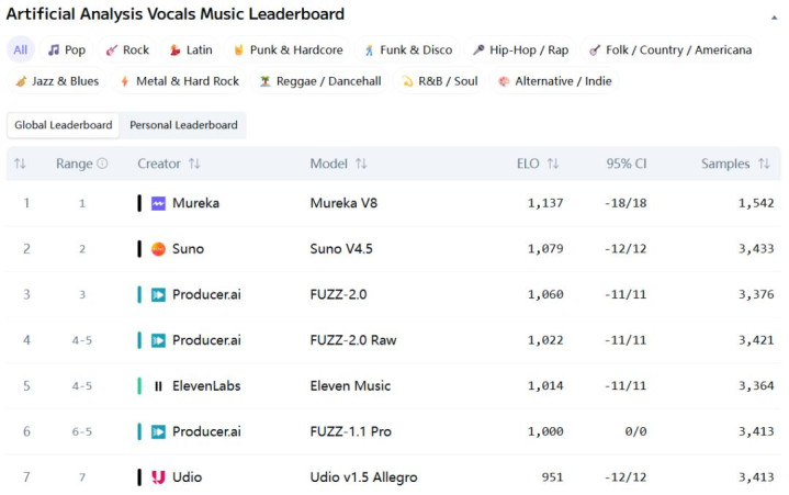 榜单地址:https://artificialanalysis.ai/music/leaderboard/vocals
