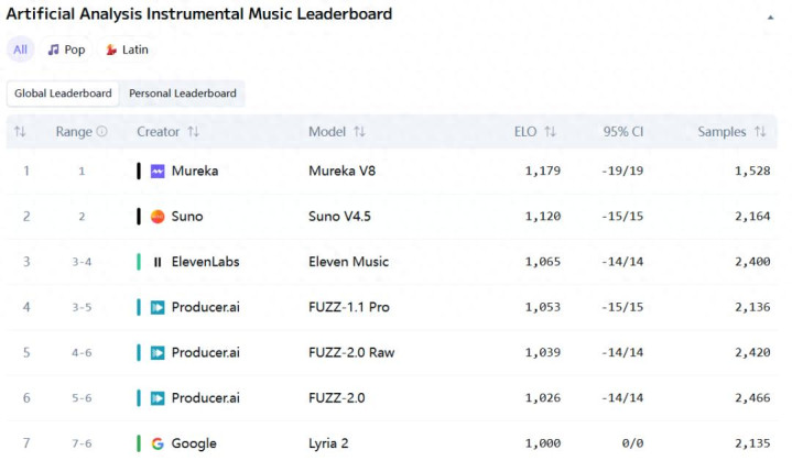 榜单地址:https://artificialanalysis.ai/music/leaderboard/instrumental
