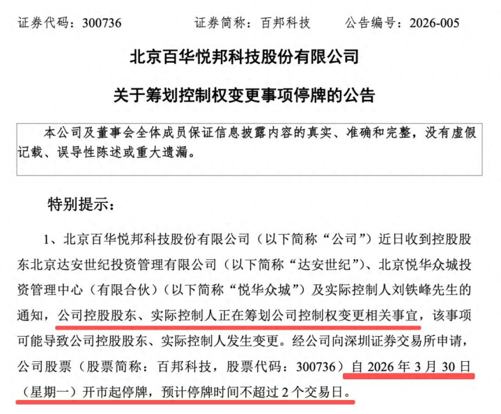 百邦科技默示,这次甩手权变更事项可能导致公司控股推动、骨子甩手东说念主发生变更。经公司向深圳证券往复所肯求,公司股票自2026年3月30日(星期一)开市起停牌,展望停牌技能不跳跃2个往异日。
