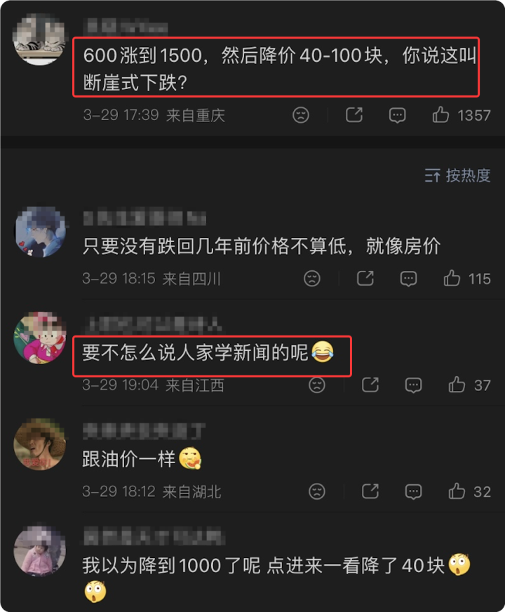 该微博热评第一1300+赞:600涨到1500,然后降价40-100块,亚搏(中国)app你说这叫断崖式下降?