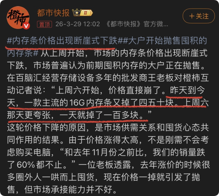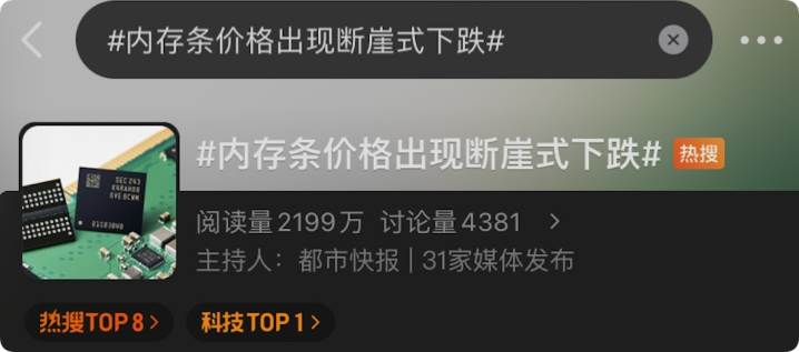 29日科技热搜第一:「内存条价钱出现断崖式下降」