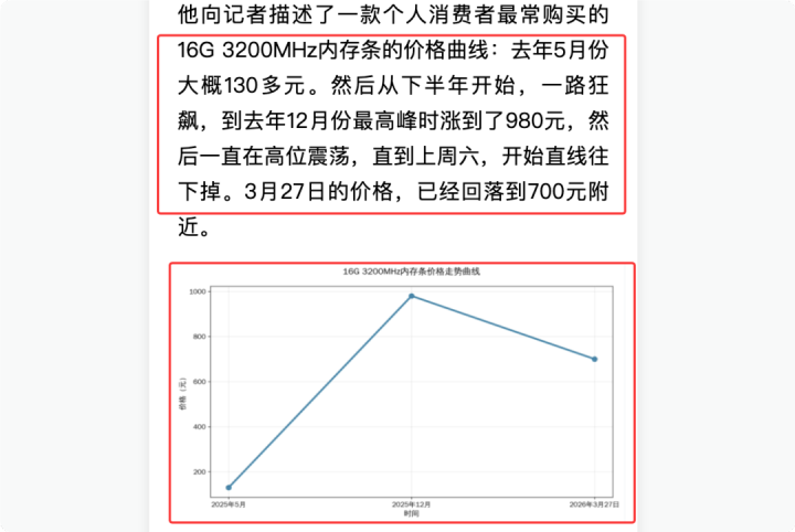 “昨天到今天,一款主流的16G内存条又掉了四五十块。上周六那天更夸张,一天就掉了一百多块。”