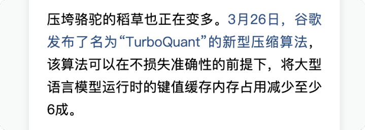 另外还有一件事,原报谈中提到的谷歌TurboQuant压缩算法