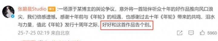 然后再来说她激发的一场明星之间的争议,启事是她在酬酢平台上翻唱《年轮》这首歌的时候标注的原唱是张碧晨。