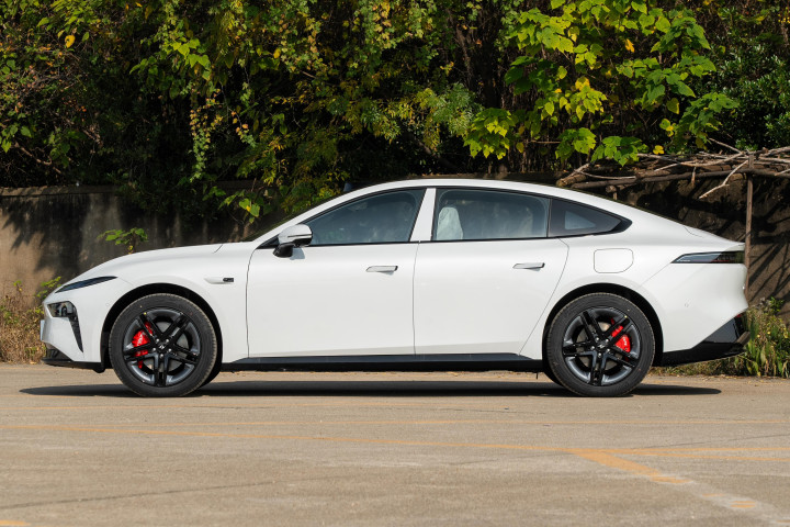 车身侧面收货于4880mm的车身长度显得十分修长,从A柱延长至尾部接收了弧形的处置,优化了空气能源学,车门接收的是普遍框的筹办,遁藏式门把手的造型大要保险侧面的弧线好意思,19英寸的熏黑式铝合金轮毂搭配红色刹车卡钳,显得证据感透顶,既能跑得快,又能刹得住,前/后轮胎尺寸均为245/45 R19。