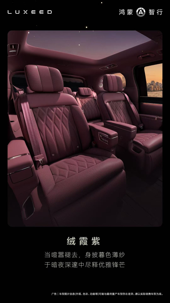 韶华杏的亮堂通透,恰如破晓时辰的静谧晨曦,为防卫生存庆典感的高端东谈主群营造出开朗广袤的心思;赤茶橘则如正午阳光般丰沛狠恶,迸发着闹热的人命力,成为用户个性与审好意思外化的私有抒发;而当暮色四合,绒霞紫便以宽阔优雅的矛头,呼应着高端用户低调挥霍的旗舰气场。这种对色调气象与场景的精确拿抓,不仅知足了不同用户的审好意思需求,更从细节处夯实了智界V9手脚9系旗舰居品的高档豪华气质与身份感。