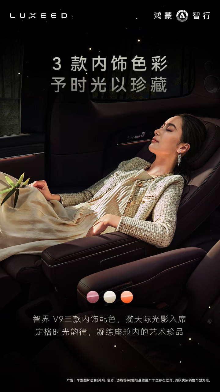 在高端豪华车的语境中,色调从来不仅仅视觉的点缀,更是品牌好意思学与用户气象的深度相接。智界V9这次发布的三款内饰配色——韶华杏、赤茶橘、绒霞紫,其灵感源自一日三时的光影幻化,将时间的韵律凝固于座舱之内,展现出杰出功能层面的气象价值。