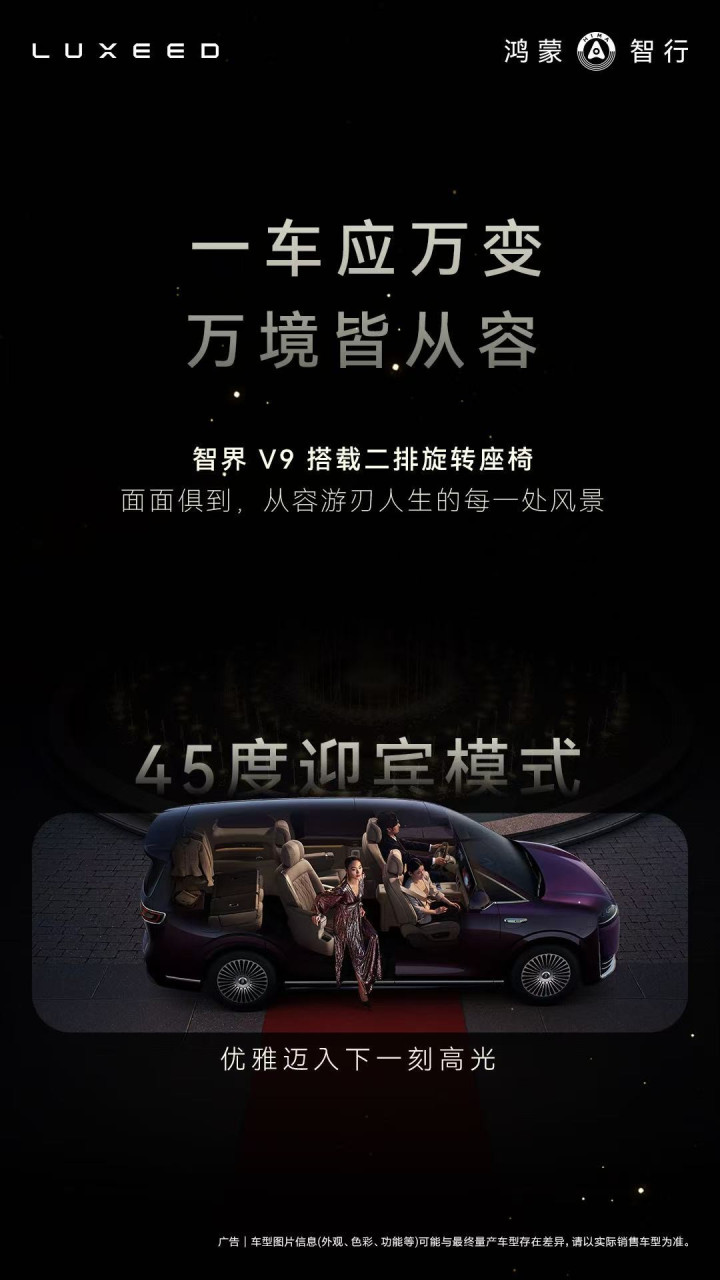 手脚鸿蒙智行首款9系旗舰MPV,智界V9承载了品牌关于高端出行的通盘贯穿与贪念。它不仅是华为在科技、蓄意等鸿沟才气的集大成者,更通过对出行场景的潜入知悉,从头界说了MPV应有的豪华体验。