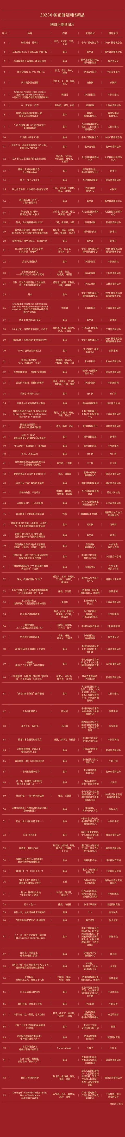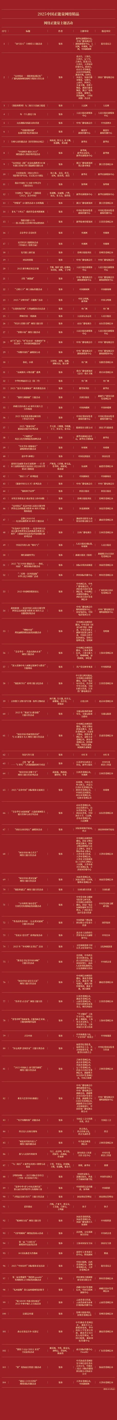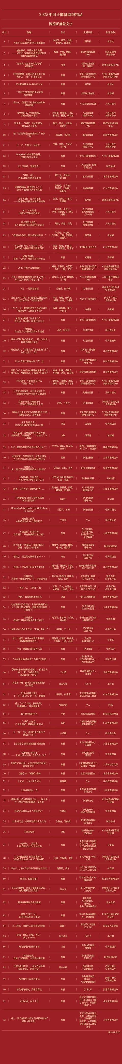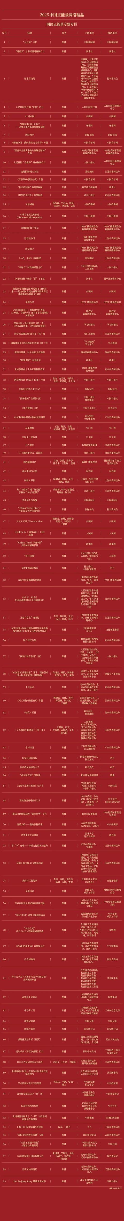 由中央网信办主持的2025中国正能量收集杰作搜集展播举止今天揭晓后果,历程群众评审、各人评议、评委线上打分和线下评审以及后果公示,豪门国际官网娱乐平台50件十佳收集杰作及500件收集杰作脱颖而出,名单如下: