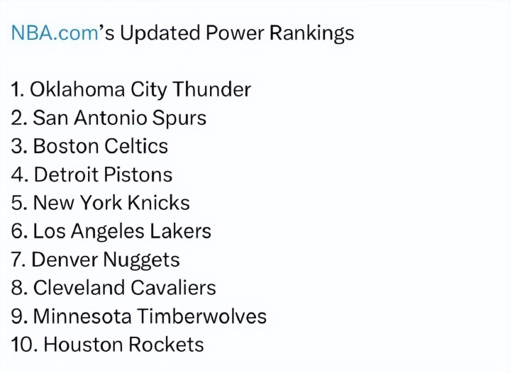 NBA官宣定约最新球队战力榜,定约战绩前二的雷霆和马刺稳居前二,凯尔特东谈主反超东部第一的活塞升至战力榜第三,湖东谈主第六,火箭下滑至第十。