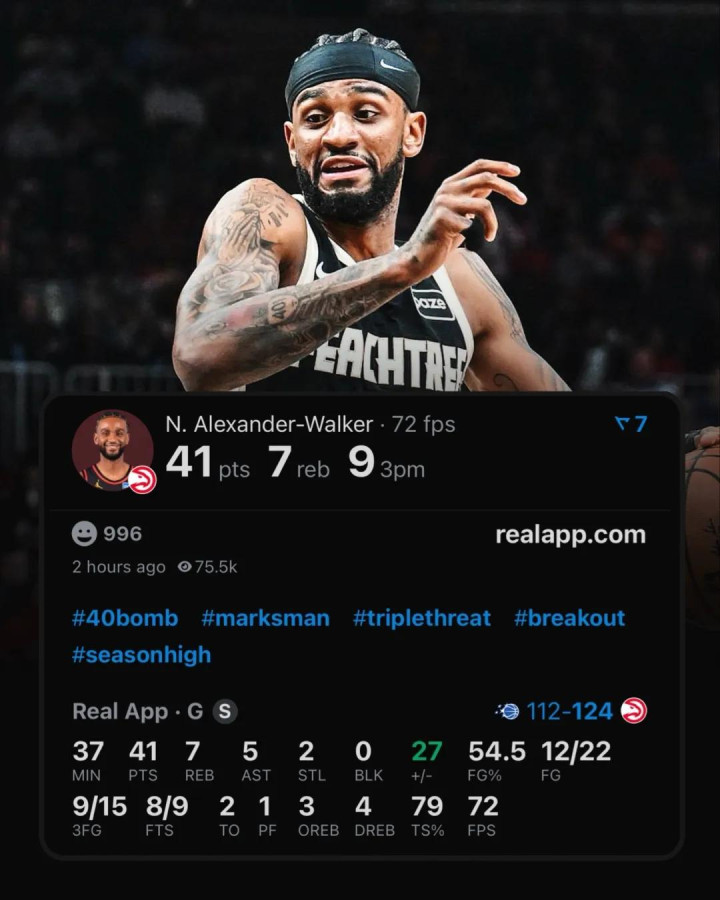 老鹰有别称球员的跳跃幅度号称神速,即雷霆球星亚历山大的表弟亚历山大-沃克,后者最近对阵魔术比赛投篮21中12,其中三分14中9狂轰活命新高的41分外加7板5助2断,豪门国际官网娱乐平台正负值+27。