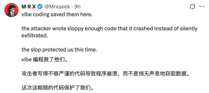 据说,坏心代码的开荒者选拔了 AI 编码导致出现 Bug,有开荒者默示「vibe coding」这次救了咱们。