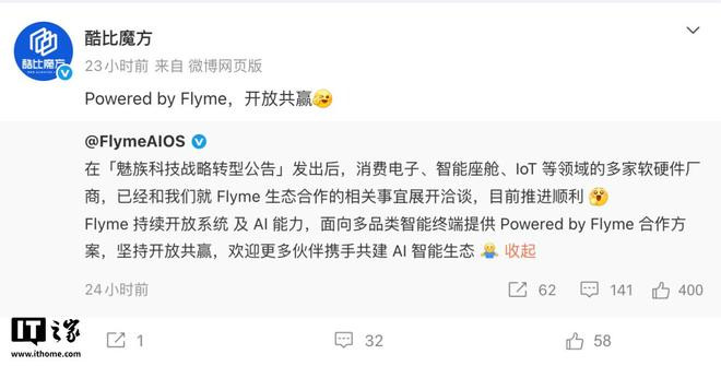 IT之家3月25日音信,酷比魔方昨天在微博发文,征引魅族FlymeAIOS官方账号公告,配文称“PoweredbyFlyme,怒放共赢”,暗意酷比魔方新品掌玩mini4Ultra将搭载Flyme系统。